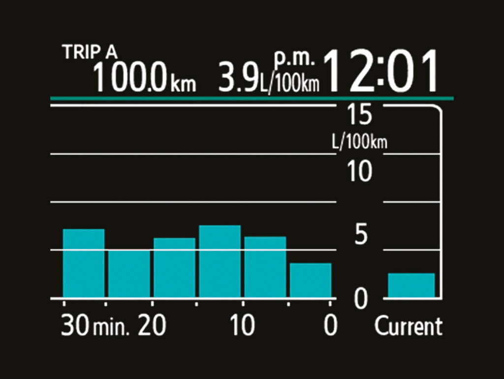 Der Yaris Hybrid hat weder dieses Display und auch keine Eco-Score-Anzeige. Die einzige Motivation ist die Anzeige des Verbrauchs (auch als Diagramm).